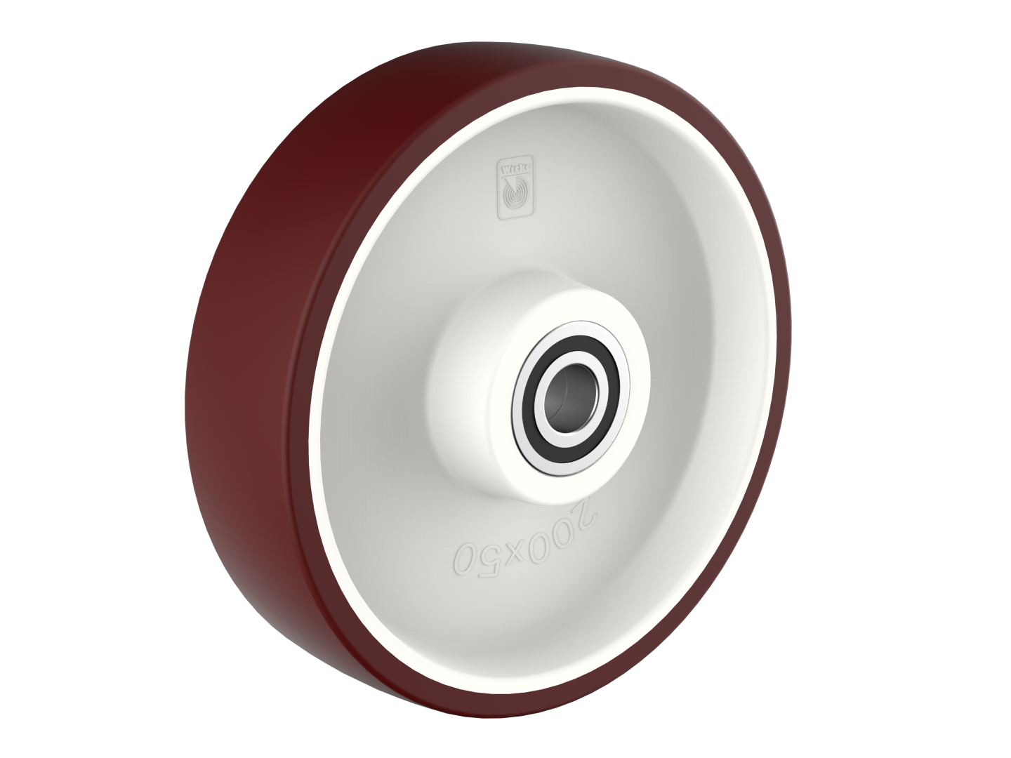 DS wheels have a pearl ruby red running surface made of thermoplastic Polyurethane (TPU) in 96 Shore A directly injected on a Polyamide (PA 6) wheel centre. The wheels are available with roller bearing or with ball bearing.