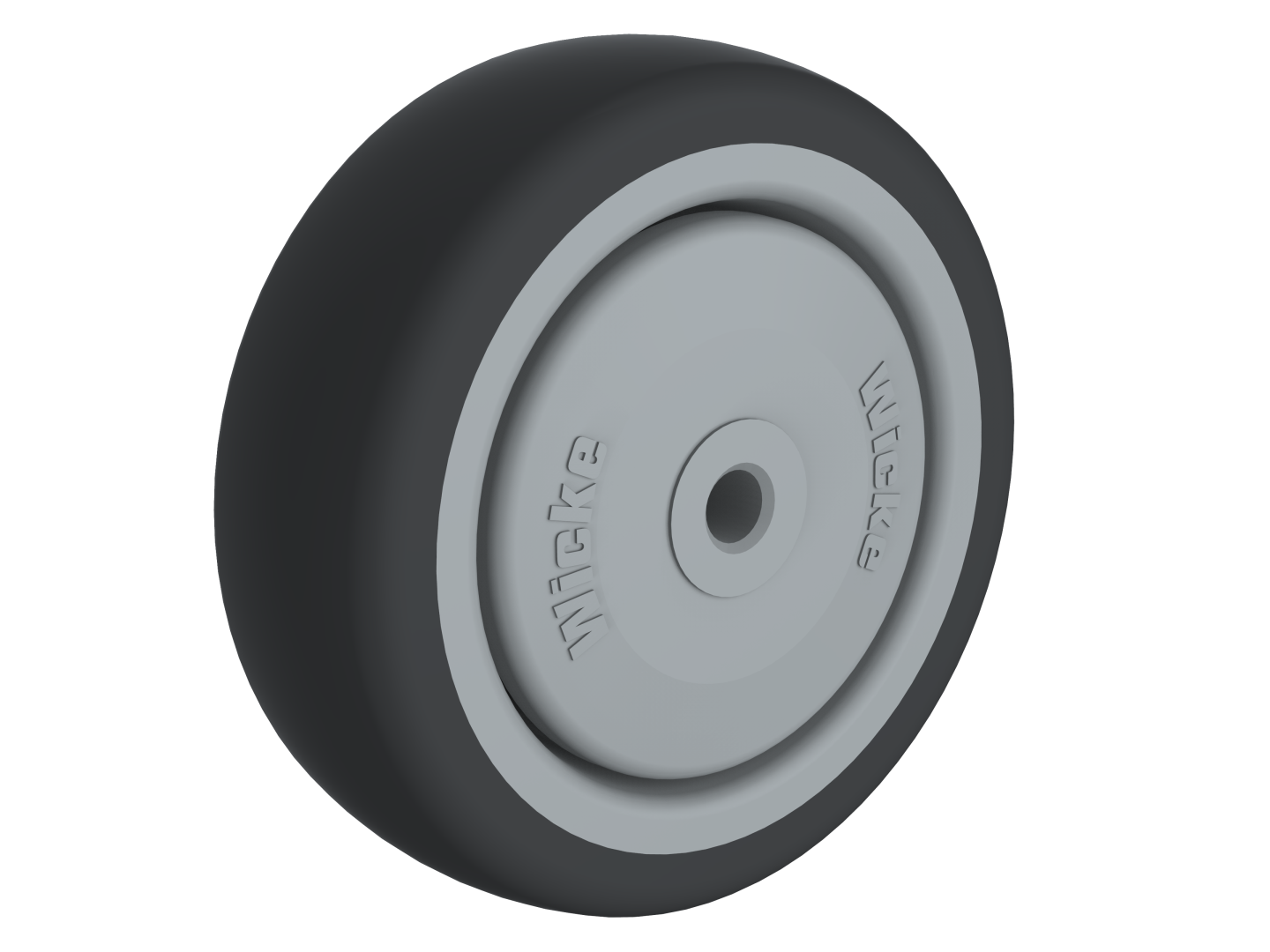 EP series wheels have a dark grey running surface in thermoplastic elastomer (TPE) in appr. 85 Shore A, which is directly injected onto a light grey Polypropylene rim. The wheels are available with plain bearing or with ball bearing.