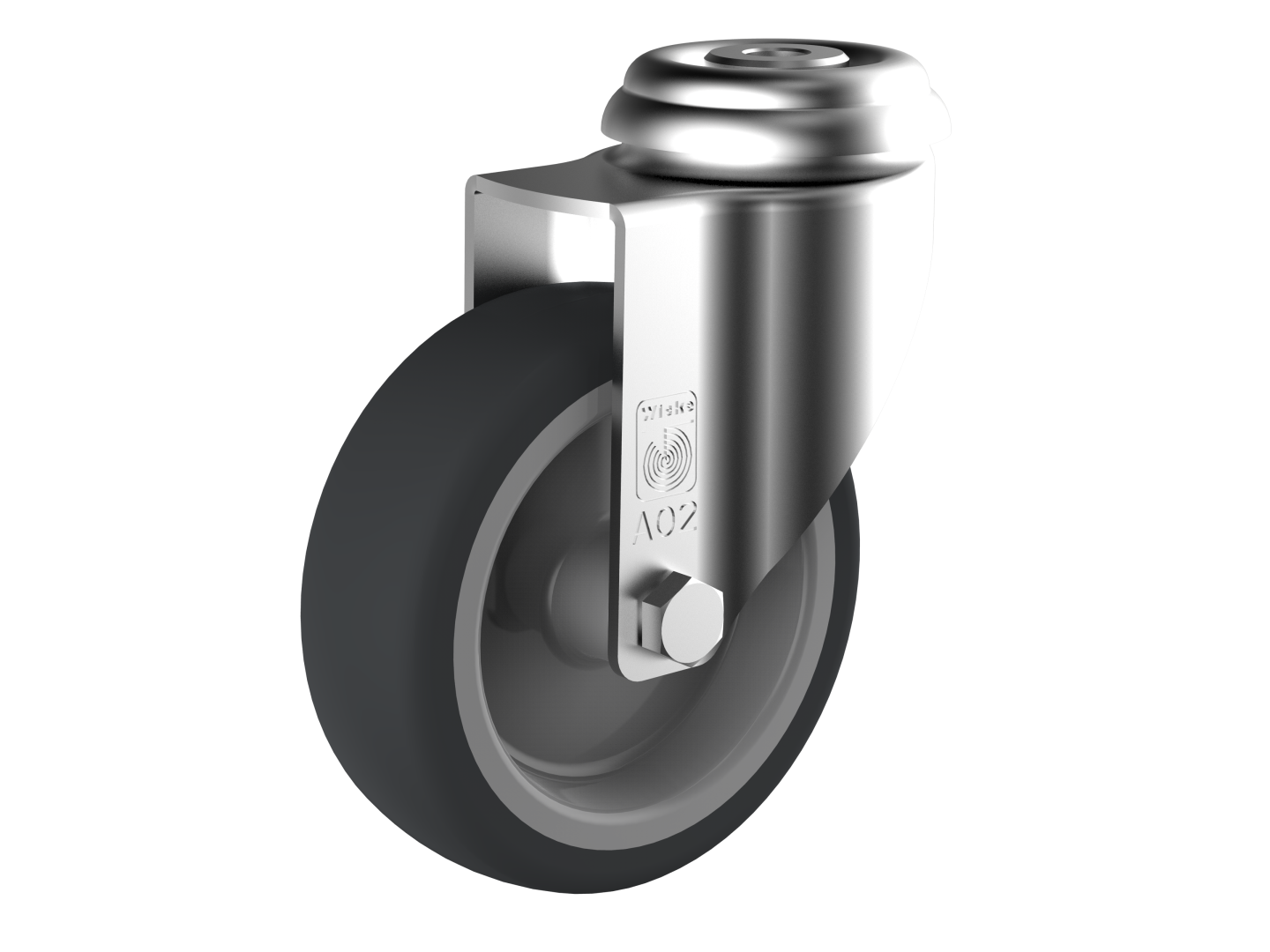 Steel swivel forks with single bolt hole. Swivel head with double ball race. The top plate with single bolt hole is directly riveted to the fork to ensure smooth movement with minimal tolerances in the swivel head. The series RAR is suitable for manually moved loads up to 100 kg. EP series wheels have a dark grey running surface in thermoplastic elastomer (TPE) in appr. 85 Shore A, which is directly injected onto a light grey Polypropylene rim. The wheels are available with plain bearing or with ball bearing.