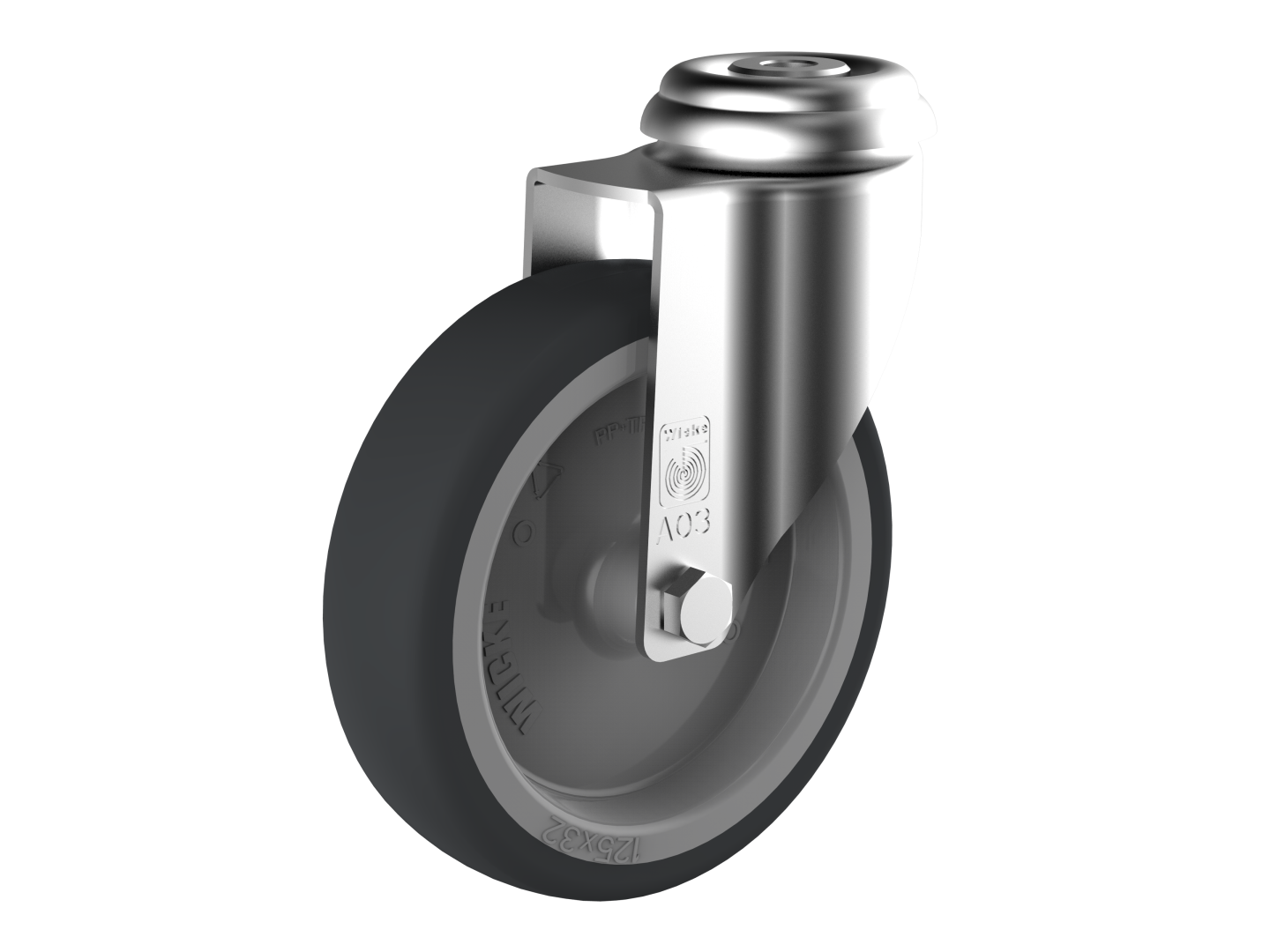 Steel swivel forks with single bolt hole. Swivel head with double ball race. The top plate with single bolt hole is directly riveted to the fork to ensure smooth movement with minimal tolerances in the swivel head. The series RAR is suitable for manually moved loads up to 100 kg. EP series wheels have a dark grey running surface in thermoplastic elastomer (TPE) in appr. 85 Shore A, which is directly injected onto a light grey Polypropylene rim. The wheels are available with plain bearing or with ball bearing.