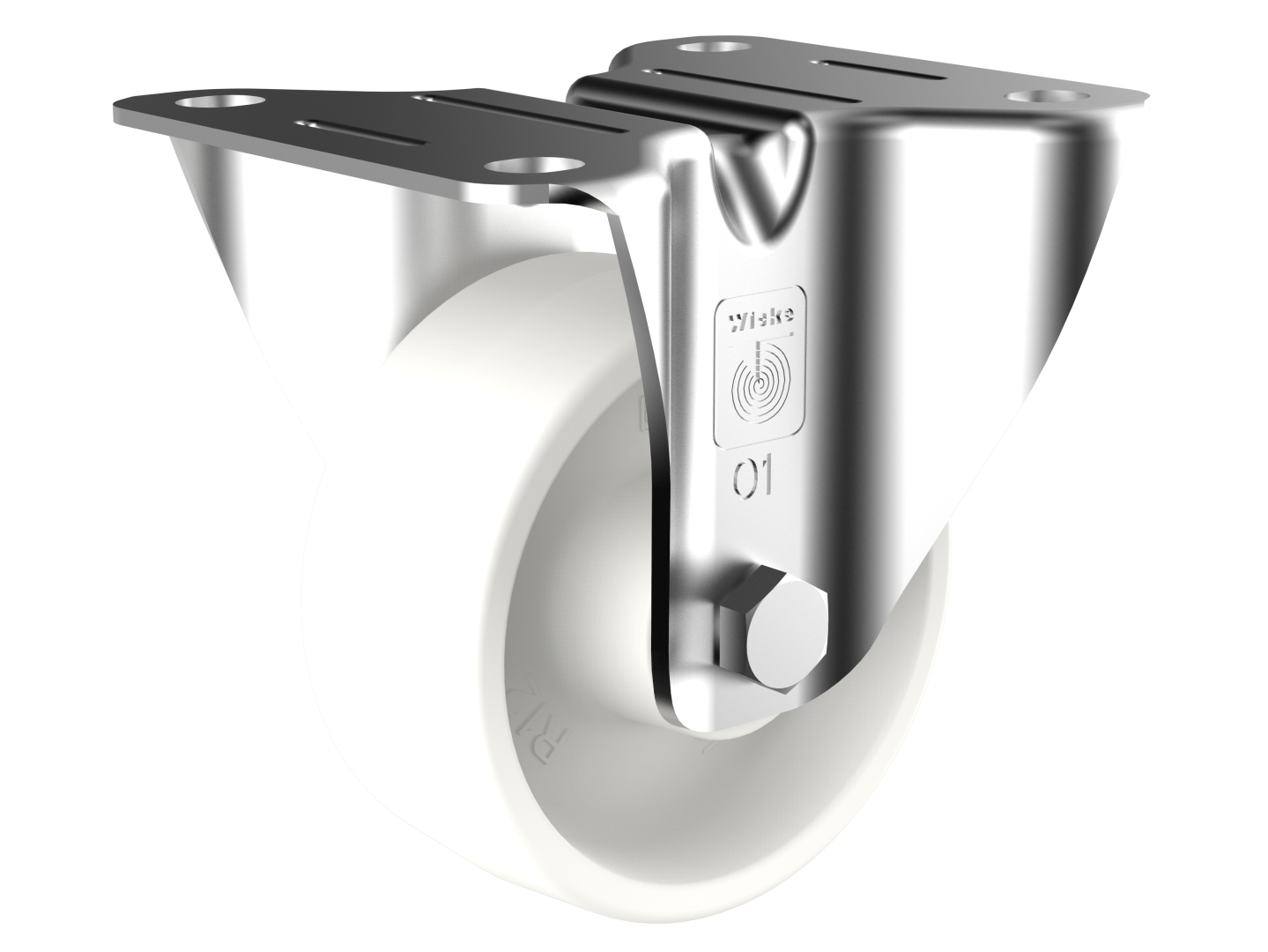 Fixed Bracket with plate fixing are made of reinforced pressed steel sheet which is subsequently galvanized. The series B is suitable for manually moved loads up to 150 kg. The Wheel of the series KN are die casted Wheel made of high quality Polyamide PA 6 in natural colour (white). The Wheel are available with plain bearing, roller bearing or ball bearing. Polyamide 6 is suitable for applications for a temperature range of -40° up to +90°C.