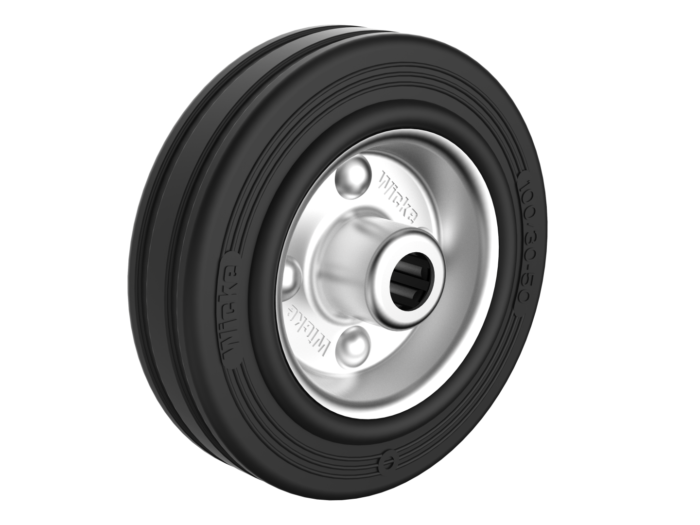 Wheels of the series GB are made of a multipart riveted steel rim with a pressed on black standard rubber tyre with a shore hardness of 82 Shore A. The wheels are with roller bearings.