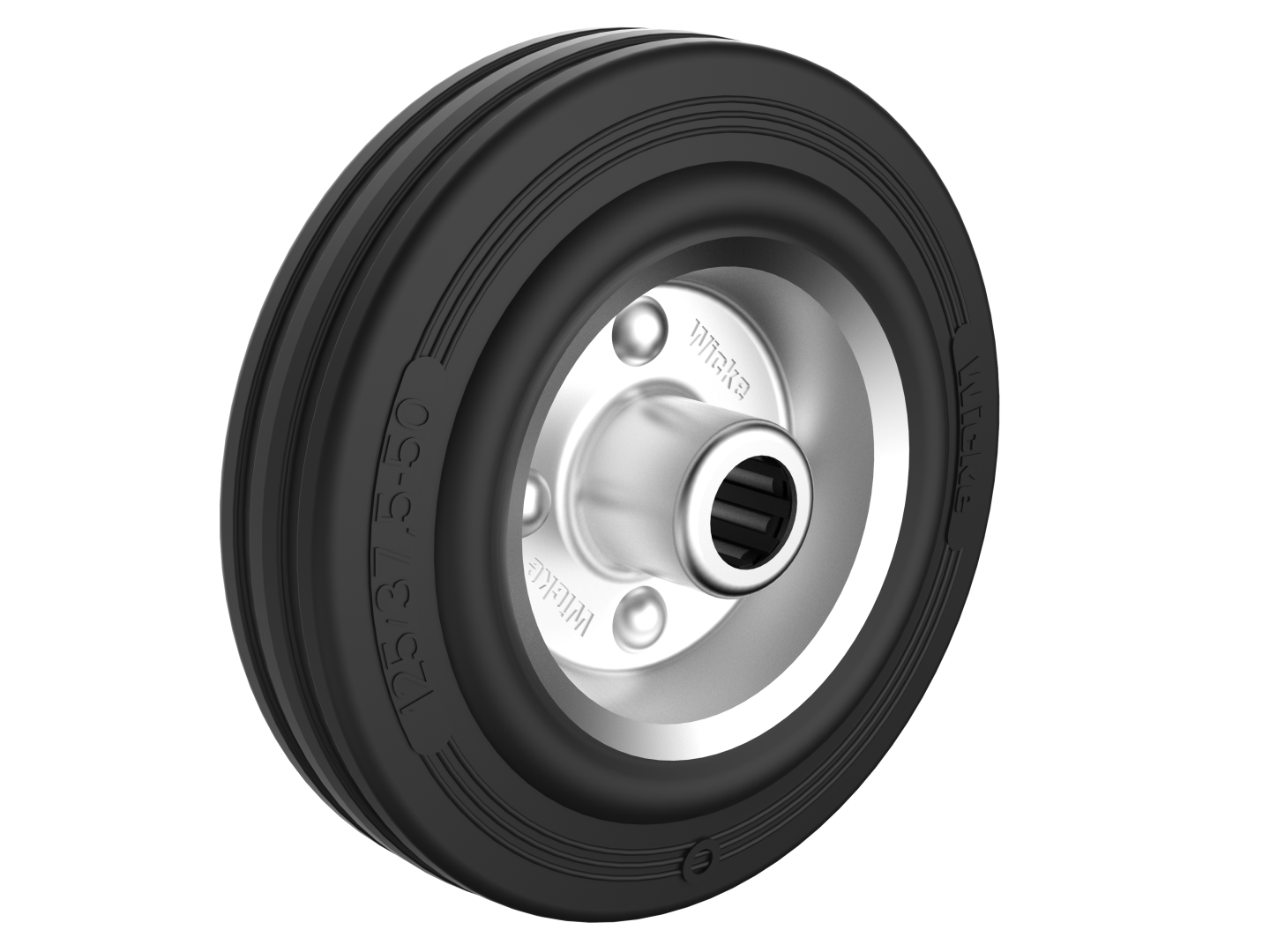 Wheels of the series GB are made of a multipart riveted steel rim with a pressed on black standard rubber tyre with a shore hardness of 82 Shore A. The wheels are with roller bearings.
