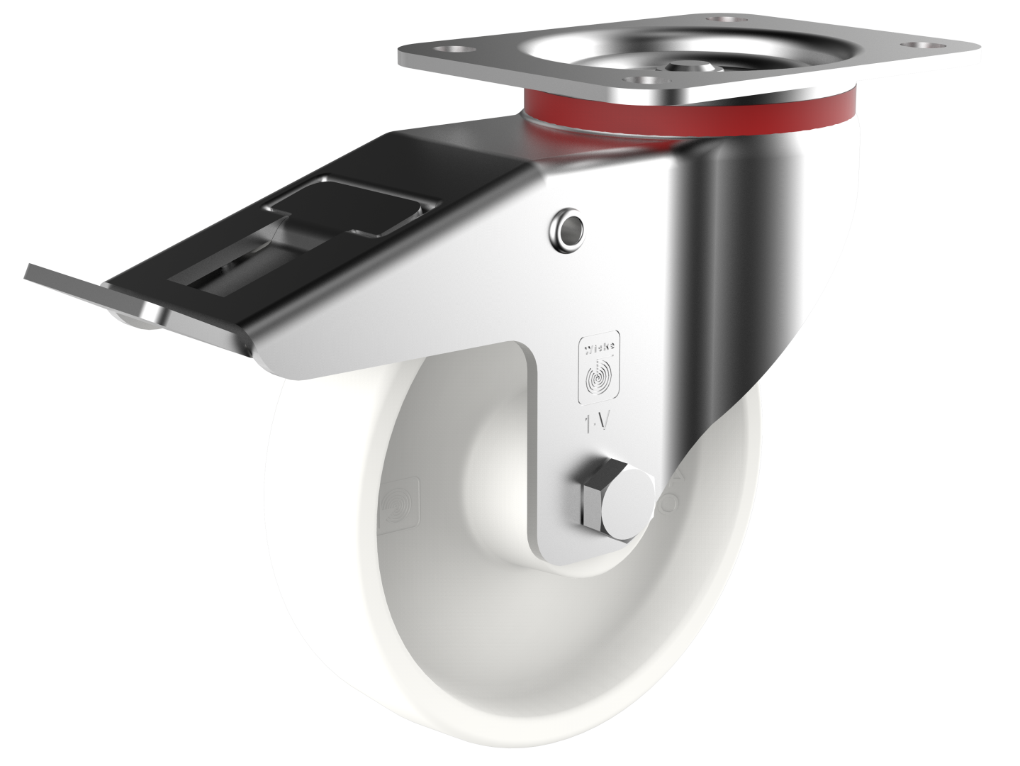 Steel swivel forks with top plate. Swivel head with double ball race which is sealed to protect against dust and dirt. The top plate with four bolt holes is directly riveted to the fork to ensure smooth movement with minimal tolerances in the swivel head. The series L is suitable for manually moved loads up to 200 kg. The wheels of the series KN are die casted wheels made of high quality Polyamide PA 6 in natural colour (white). The wheels are available with plain bearing, roller bearing or ball bearing. Polyamide 6 is suitable for applications for a temperature range of -40° up to +90°C. Total Stop Brake