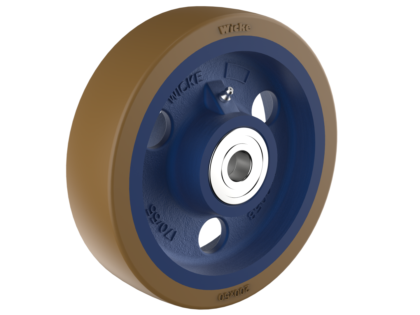 Wheels of the serie PG are made of a cast iron wheel centre with a vulcanised polyurethane Wicke – Topthane® 92 Shore A tyre. The Topthane® tyre is bonded to the wheel centre with a special bonding agent. The tyre is abrasion resistant with low starting and rolling resistance. The tyre is cut proof and has good tear strength. The wheels are with ball bearings.