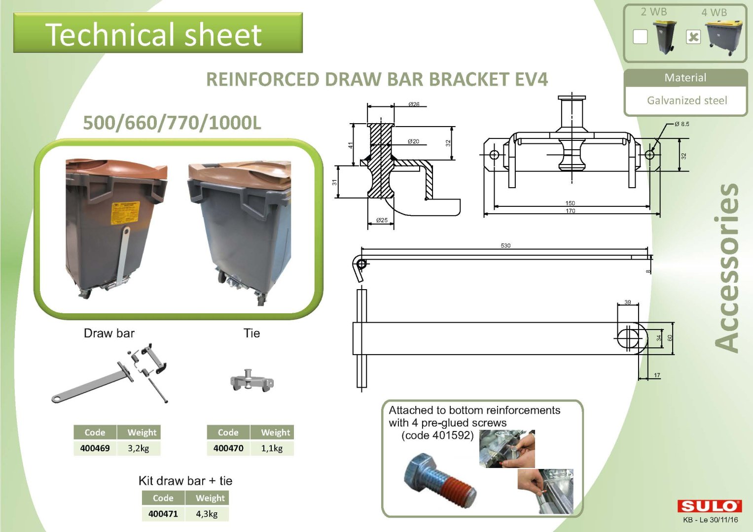 <p>Sulo EV4 Bin Towing system 400471</p><p>Drawbar hitch for waste bins<br></p><p>Retro-fit to existing waste bins&nbsp;<span style="color: rgb(102, 154, 51); font-family: Helvetica; font-size: 24px;">500/660/770/1000L</span></p><p><span style="color: rgb(102, 154, 51); font-family: Helvetica; font-size: 24px;">Contains drawbar and tie</span></p><p><span style="color: rgb(102, 154, 51); font-family: Helvetica; font-size: 24px;">See attached technical sheet for&nbsp;</span><font color="#669a33" face="Helvetica" size="5"><span style="caret-color: rgb(102, 154, 51);">dimensions</span></font></p>