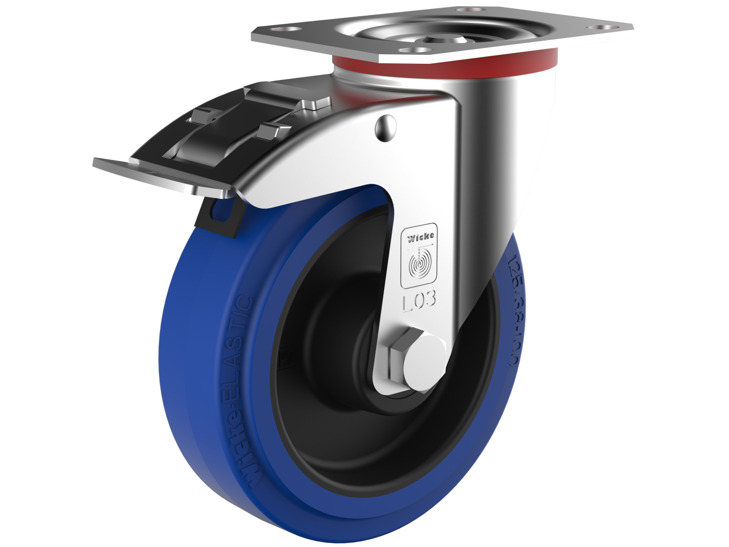 Steel swivel forks with top plate. Swivel head with double ball race which is sealed to protect against dust and dirt. The top plate with four bolt holes is directly riveted to the fork to ensure smooth movement with minimal tolerances in the swivel head. The series L is suitable for manually moved loads up to 250 kg. Wheel of the series BN are made of a one-piece Polyamide wheel center with a directly vulcanized high quality blue Wicke – ELASTIC® rubber tyre with 63 Shore A hardness. The Wheel are available with roller bearing.