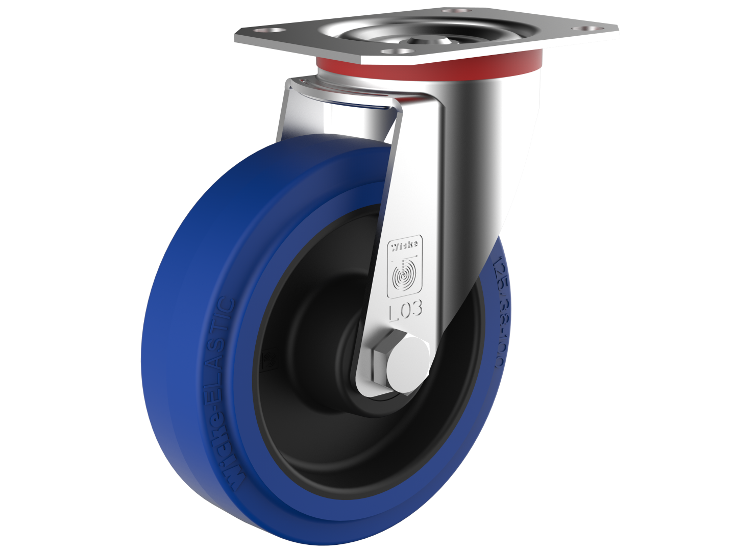 Steel swivel forks with top plate. Swivel head with double ball race which is sealed to protect against dust and dirt. The top plate with four bolt holes is directly riveted to the fork to ensure smooth movement with minimal tolerances in the swivel head. The series L is suitable for manually moved loads up to 200 kg. Wheel of the series BN are made of a one-piece Polyamide wheel center with a directly vulcanized high quality blue Wicke – ELASTIC® rubber tyre with 63 Shore A hardness. The Wheel are available with roller bearing.