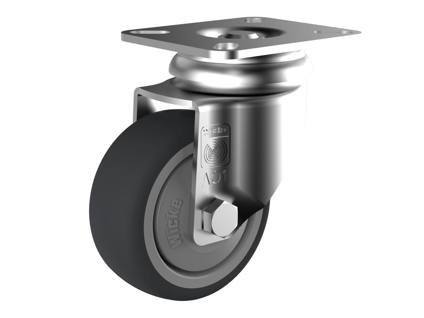 Steel swivel forks with top plate. Swivel head with double ball race. The top plate with four bolt holes is directly riveted to the fork to ensure smooth movement with minimal tolerances in the swivel head. The series LAR is suitable for manually moved loads up to 100 kg. EP series Wheel have a dark grey running surface in thermoplastic elastomer (TPE) in appr. 85 Shore A, which is directly injected onto a light grey Polypropylene rim. The Wheel are available with plain bearing or with ball bearing.