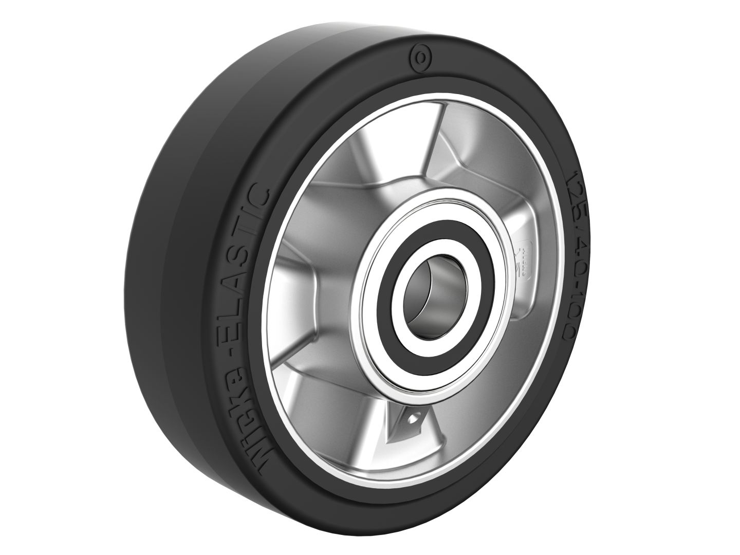 Wheel of the series DE are made of a one-piece aluminum die cast wheel centre with a directly vulcanised black Wicke – ELASTIC® rubber tyre in free running wheel quality with a hardness of 63 Shore A. The Wheel are with ball bearings.